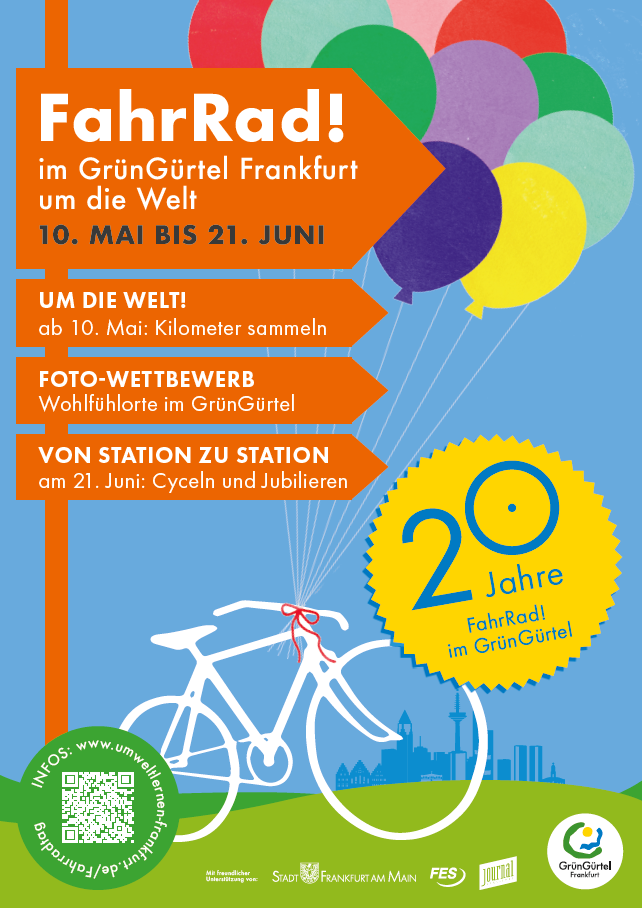 Zum 20. Jubiläum lockt die Rund-um-die-Welt-Challenge bereits vor dem großen Aktionstag ins StadtLand. Sechs Wochen lang können unter dem Motto „FahrRad! im GrünGürtel um die Welt“ alle ihre per pedale gefahrenen Kilometer sammeln. Es zählt jede Strecke, die im GrünGürtel und auf dem Weg dorthin auf dem Fahrrad zurückgelegt wurde. Einzeln oder in Teams von Freunden und der Familie, aus Schulen, Firmen oder Vereinen werden hier Kilometer gesammelt, um die Strecke von 27.500 km – rund um die Welt auf unserem Breitengrad –zusammenzutragen. Los geht es am 10. Mai, dem GrünGürtel-Tier-Geburtstagsfest. Am FahrRad!-Tag selbst wird um 16 Uhr zusammengezählt, ob es für den Rekord reicht. Den Radler:innen mit dem meisten Kilometern winken tolle Preise.