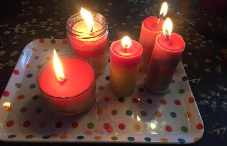 Ihr könnt auch die fertigen Kerzen nochmal in farbiges geschmolzenes Wachs tauchen, wenn Ihr doch noch eine andere Farbe möchtet.