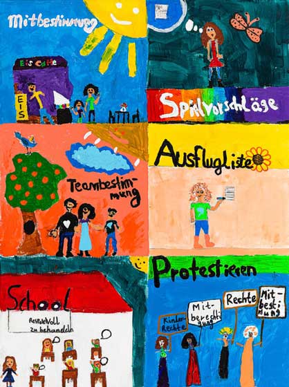Eine ähnliche Botschaft haben Ella und Danawit hinterlassen. Sie haben ihr Gemeinschaftsbild in sechs Felder unterteilt und zeigen darin Szenen, in denen es um Meinungen geht, ob nun bei Spielvorschlägen, der Ausflugsliste und dem Protestieren.