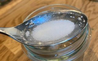Eine gründliche Reinigung bekommen sollten auch die Figuren, Steine oder was auch immer an Innenleben in die Kugel soll. Wir haben unsere Steine, Figuren und auch die Tannenzweige ins kochendes Wasser gegeben. Auch nach zwei Wochen zeigte sich noch keine Trübung oder Färbung, was bei frischem Grün jedoch sehr schnell passieren kann. Wer ganz sicher gehen möchte, kann im Drogeriemarkt destilliertes Wasser kaufen. Mit den dort üblichen Literflaschen lassen sich je nach Größe drei bis vier Gläser füllen. Wegen des frischen Tannengrüns, das ebenfalls mit kochendem Wasser präpariert wurde, kamen in dieses Glas einige Spritzer einer Wasserklar-Lösung, die es beispielsweise in Bastelläden gibt.