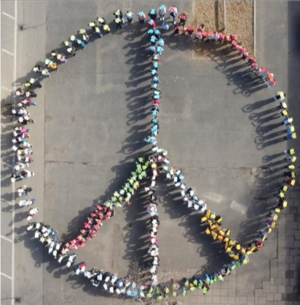 Mit dem Peace-Zeichen will die Schule bekunden, dass „wir an die Menschen in aller Welt denken, die gerade im Krieg leben müssen. Wir möchten den Menschen zeigen, dass wir an ihrer Seite stehen und dass sie nicht allein sind.“